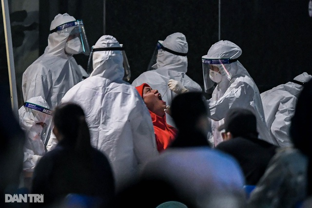 Trắng đêm xét nghiệm SARS-CoV-2 cho người dân tòa nhà 88 Láng Hạ. Ảnh: Đỗ Linh.