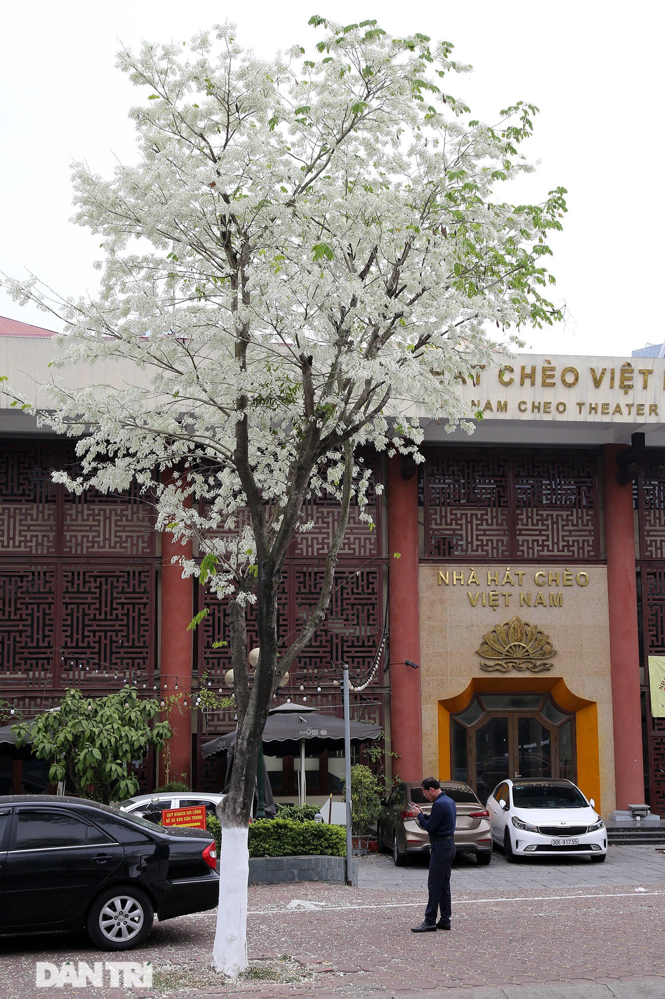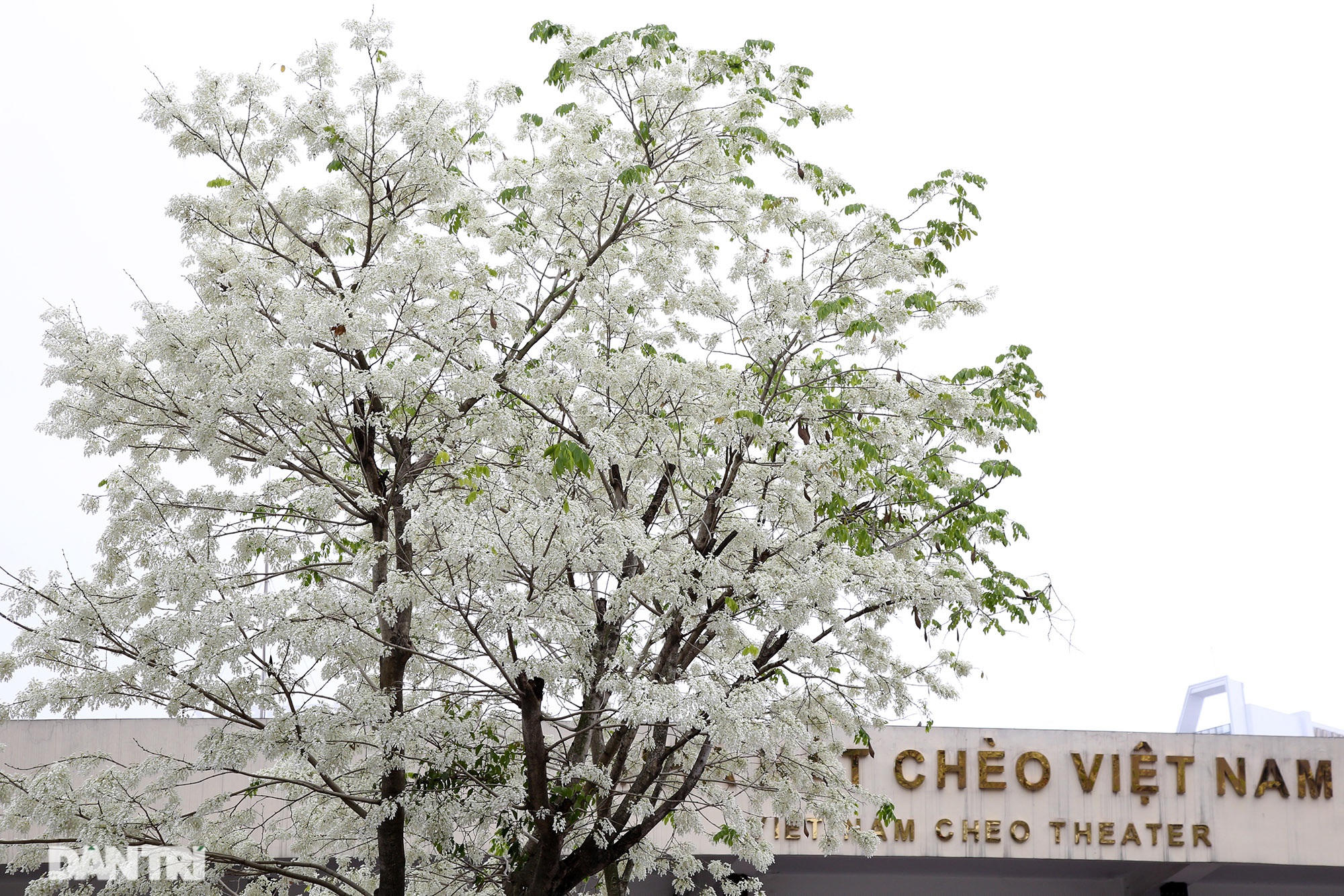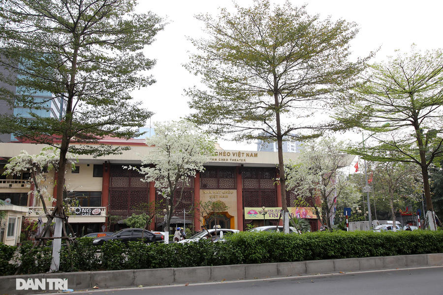 Những chùm hoa sưa nở trắng như tuyết trước cổng Nhà hát Chèo Việt Nam.