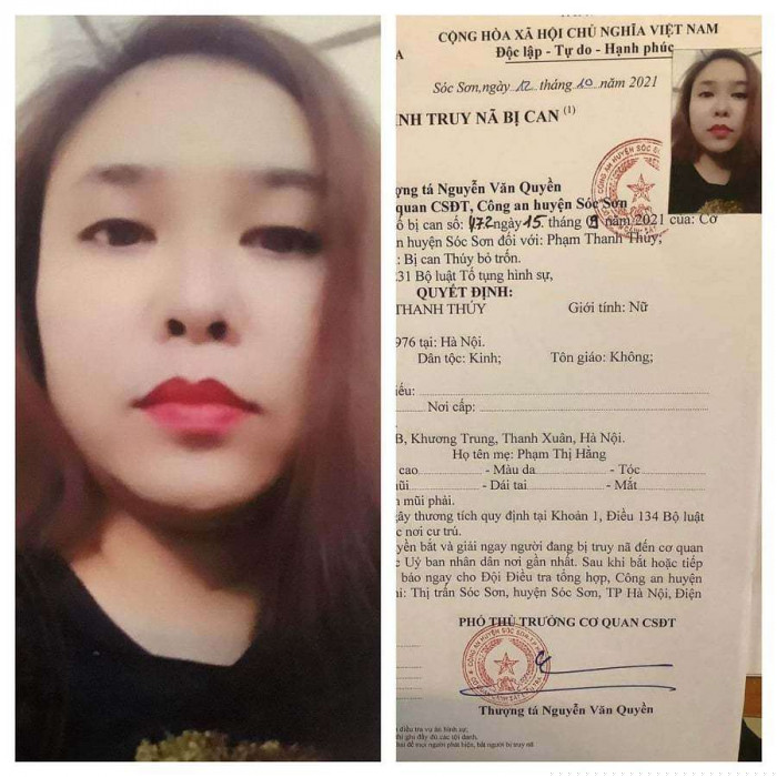 Ngày 12/10/2021, Công an huyện Sóc Sơn đã ra quyết định truy nã bị can đối với Phạm Thanh Thúy.