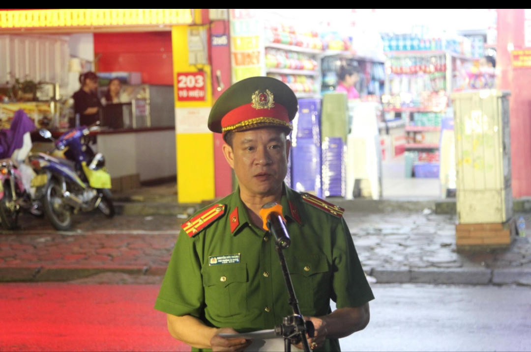 Thượng tá Nguyễn Đức Thắng - Phó Trưởng Công an Quận Cầu Giấy phát biểu tại buổi diễn tập.