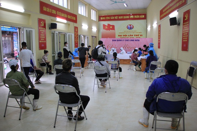 Công tác xét nghiệm nhanh được tiến hành tại Hội trường Ban quản lý chợ Long Biên. Trường hợp nghi ngờ được cách ly tạm thời ngay tại đây.