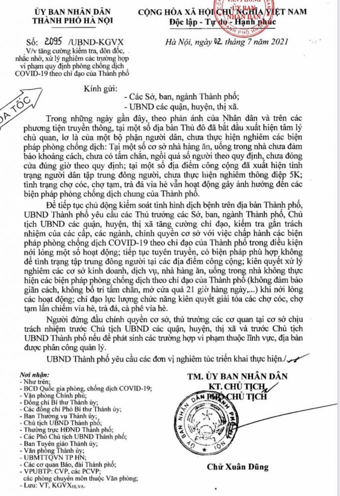 Tối ngày 2/7, Ủy ban Nhân dân (UBND) TP Hà Nội đã ra văn bản hỏa tốc số 2095/UBND-KGVX về việc tăng cường kiểm tra, đôn đốc, nhắc nhở, xử lý nghiêm các trường hợp vi phạm quy định phòng chống dịch Covid-19.