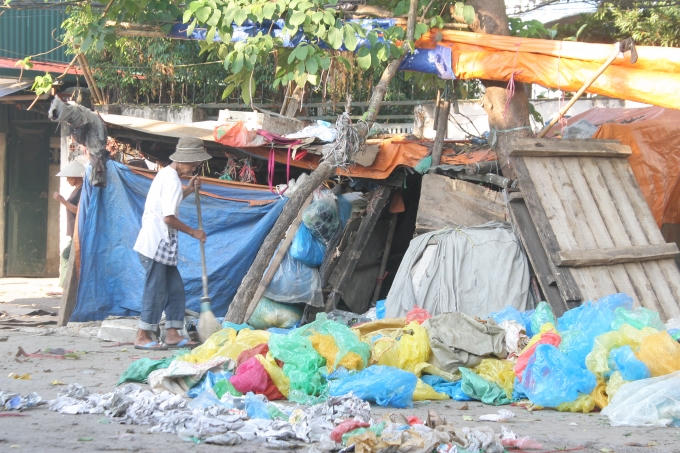 | Căn lều với diện tích chừng 10m2 nhưng vẫn được chia làm hai phần, phần để người ở và phần để đựng phế liệu |