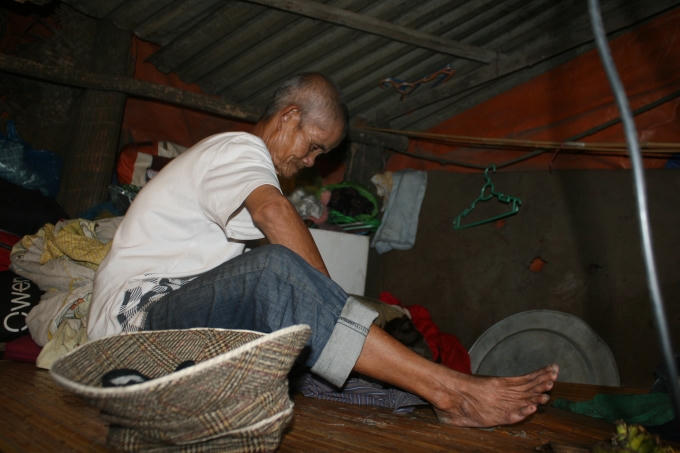 | Ngay cả lúc ngồi, ông Hùng cũng chỉ cách trần của lều chừng chục cm |