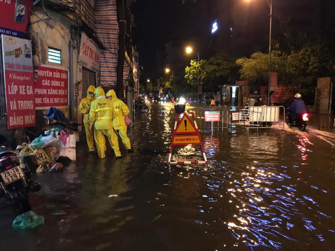 Hà Nội mưa lớn, nhiều nơi phải lập barie để cảnh báo người dân