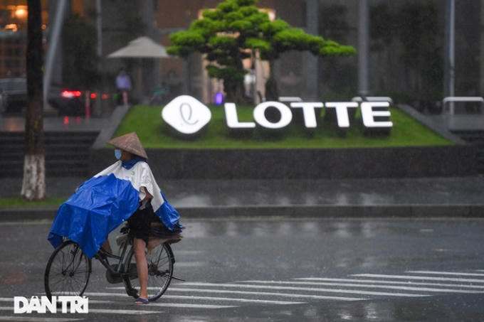 Một người phụ nữ đội mưa dừng chân chờ qua đèn đỏ chân tòa nhà Lotte.