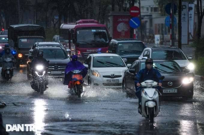 Thời điểm này đèn đường vừa tắt và bầu trời bị màn mưa che kín nên trở nên tối sầm lại, khiến nhiều phương tiện phải bật đèn pha khi lưu thông trên đường.