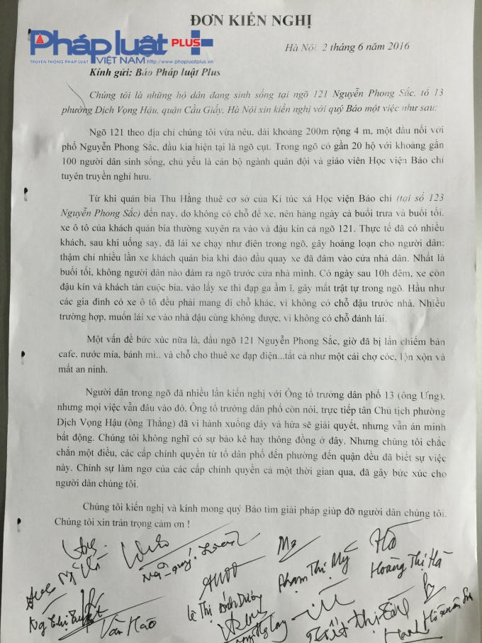 Theo đơn kiến nghị thì từ khi quán bia Thu Hằng thuê cơ sở của Kí túc xá Học viện Báo chí ( tại số 123 Nguyễn Phong Sắc ) đến nay, do không có chỗ để xe, nên hàng ngày cả buổi trưa và buổi tối, xe ô tô của khách quán bia thường xuyên ra vào và đậu kín cả ngõ 121.