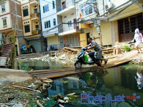 Dự án cải tạo tuyến mương tại ngõ 139 Khương Thượng chậm tiến độ khiến môi trường ô nhiễm nặng, trên mặt đường dân lát ván, bắc cầu để đi.