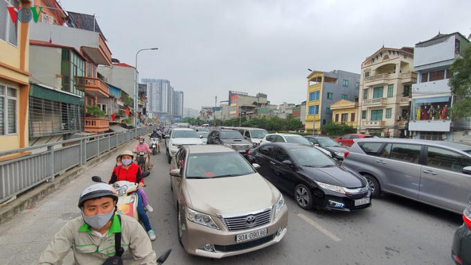 Tình trạng tắc đường đã xảy ra trên một số tuyến đường. Trong ảnh: đường Nguyễn Khoái chật cứng xe ô tô.