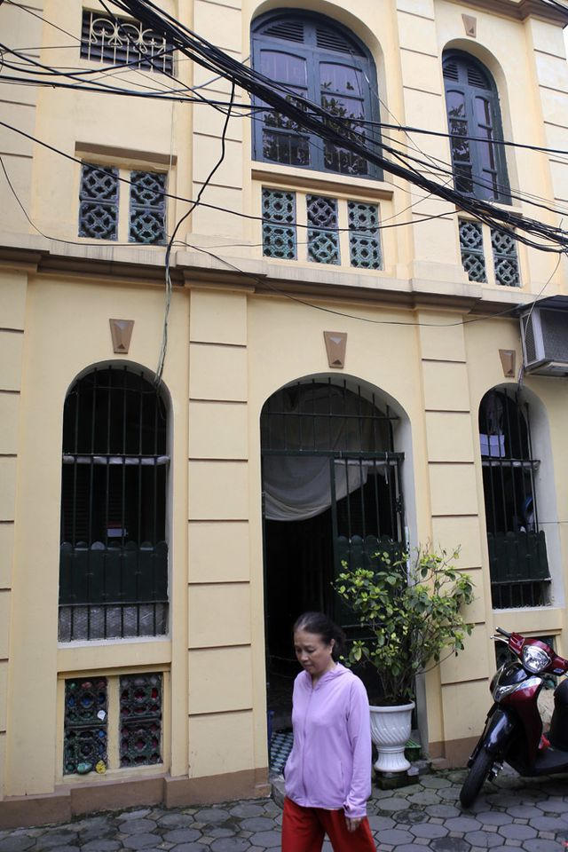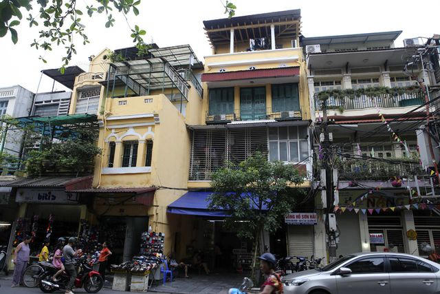 Ngôi nhà 2 tầng cổ kính trên phố Hàng Giấy được quết vôi mới và sơn lại ô cửa sổ màu xanh làm nổi bật kiến trúc xưa bên cạnh những ngôi nhà mới xây dựng.