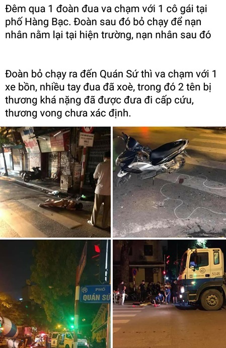 Một nhóm thanh niên tổ chức đua xe đã đâm phải một cô gái khiến nạn nhân nguy kịch, sau đó nhóm thanh niên này bỏ chạy, đến khu vực Quán Sứ thì gặp tai nạn khiến 1 người tử vong.