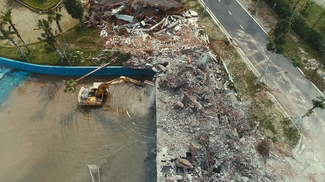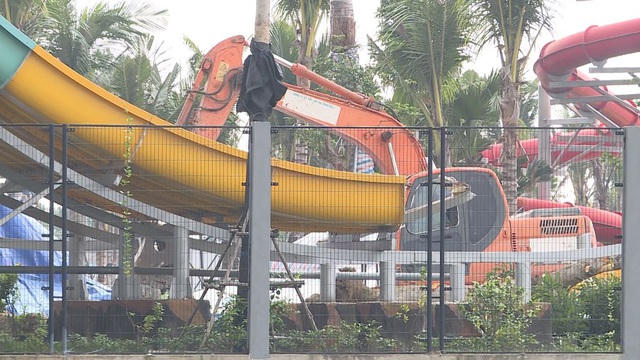 Khoảng hơn 100 người được huy động cùng nhiều máy móc để phá dỡ 19 hạng mục của công viên, bao gồm cầu trượt nước, bể tạo sóng, đài phun nước, nhà điều hành, cổng chính...