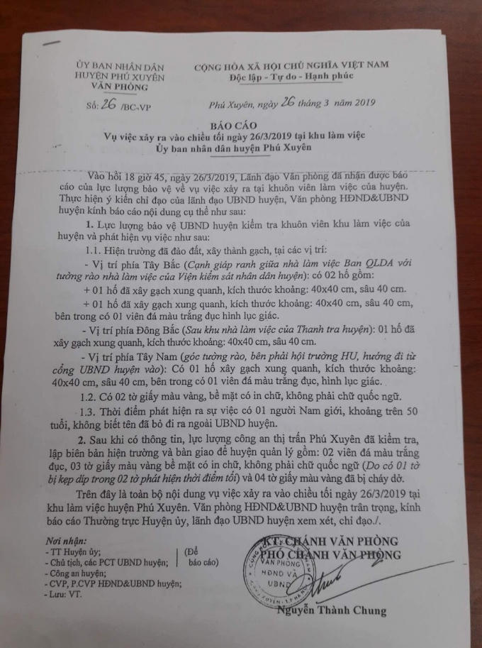 Trước sự việc việc nghiêm trọng này, Văn phòng UBND huyện Phú Xuyên đã có báo cáo xin ý kiến lãnh đạo Ủy ban huyện, đồng thời bàn giao hiện trường cho Công an Thị trấn Phú Xuyên bảo vệ nguyên hiện trạng.