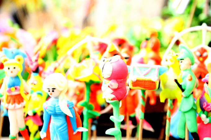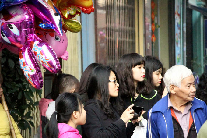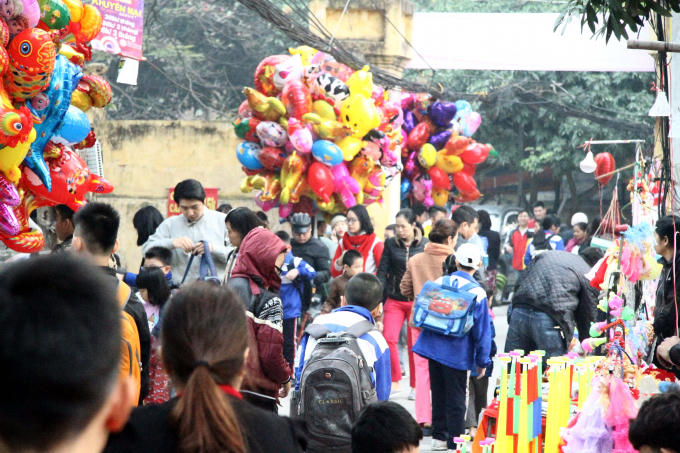 Khách đến với phiên chợ cuối năm đặc biệt này chủ yếu là trẻ em. Từng tốp học sinh từ những làng, phố quanh đó cũng đổ về đây chung vui.