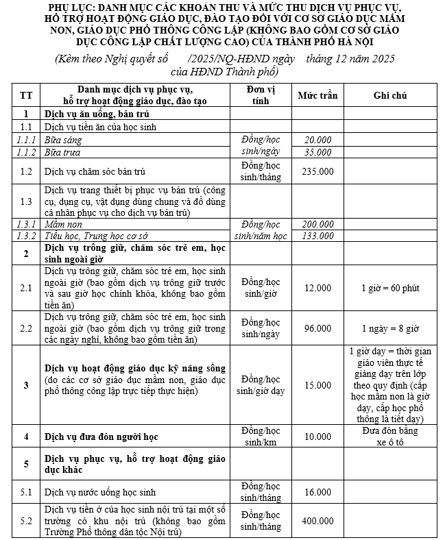 Theo đó, Nghị quyết quy định các danh mục các khoản thu và mức thu các dịch vụ phục vụ, hỗ trợ hoạt động giáo dục, đào tạo: Dịch vụ ăn uống, bán trú; dịch vụ đưa đón học sinh; dịch vụ trông giữ, chăm sóc trẻ em, học sinh ngoài giờ; dịch vụ hoạt động giáo dục kỹ năng sống; dịch vụ hỗ trợ hoạt động giáo dục khác...
