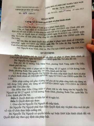 Ngày 03/7/2015 UBND quận Bắc Từ liêm có ra Quyết định xử phạt vi phạm hành chính số 2382/QĐ-XPVPHC đối với bà Nguyệt, buôc bà phải tháo dỡ phần trông trình vi phạm và nộp phạt 15 triệu đồng.