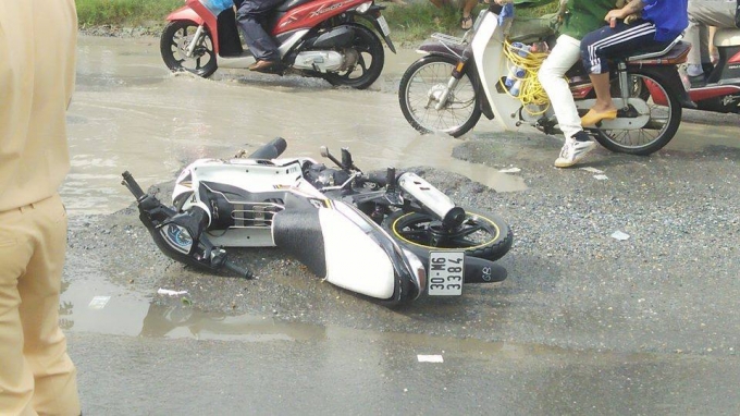 | Do mặt đường bị hư hỏng và mưa lớn khiến người điều khiển xe máy bị mất tay lái ngã xuống đường. |