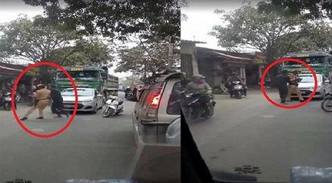 Theo đó, khi đang chặn đầu chiếc xe tải thì chiến sĩ CSGT đã bị một đối tượng mặc áo khoác đen, đeo kính đen đi xe máy đến, dừng giữa đường sau đó có hành vi xô đẩy nhằm mục đích để cho chiếc xe tải chạy thoát. Một lúc sau, tiếp tục xuất hiện một thanh niên mặc áo phông màu trắng xám ra co kéo.
