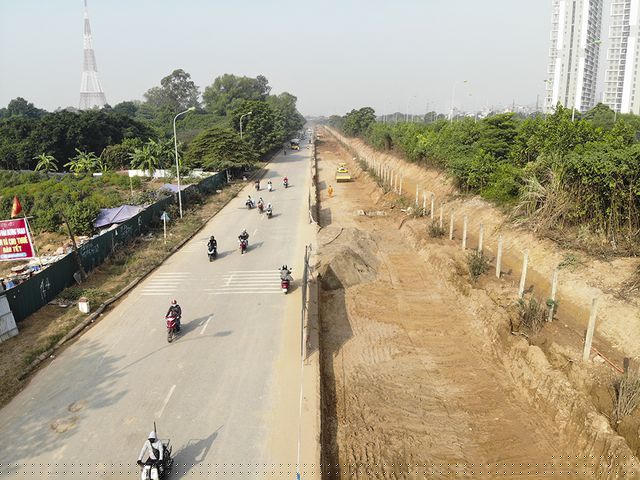 Theo ghi nhận của phóng viên, dọc 2 bên đường gom Đại lộ Thăng Long (hướng từ cầu vượt Mễ Trì đi cầu vượt Phú Đô và chiều ngược lại) đang được đơn vị thi công gấp rút hoàn thiện việc mở rộng lòng đường.