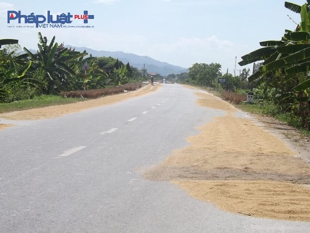 Như đã thành thông lệ, cứ mỗi dịp mùa vụ tới, ngoài những sân phơi của từng hộ gia đình, đường giao thông cũng được "hô biến" thành sân phơi, người dân vô tư đem thóc, rơm rạ phơi dọc 2 bên đường.