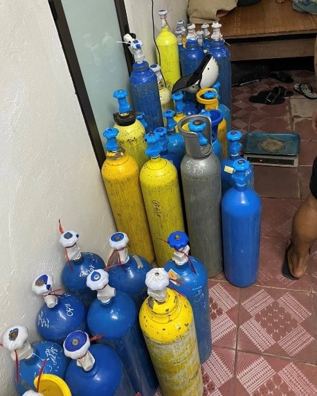 Tại thời điểm kiểm tra, Tổ công tác phát hiện bên trong nhà có 43 bình khí N2O, 63 vỏ bình cùng với 750 quả bóng cao su. Chủ số hàng trên khai nhận đã thuê nhà tại đây để cất giữ hàng hóa từ đầu tháng 8/2023, khi có khách sẽ cho nhân viên đi giao.