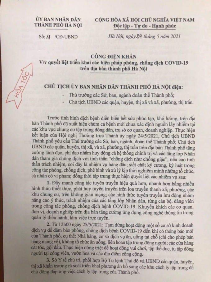 Nội dung Công điện hảo tốc nêu "Thực hiện kết luận của Hội nghị Thường trực Thành ủy ngày 24/5/2021, Chủ tịch UBND Thành phố yêu cầu Thủ trưởng các Sở, ban, ngành, đoàn thể Thành phố; Chủ tịch UBND các quận, huyện, thị xã, và xã, phường, thị trấn trên địa bàn Thành phố tăng cường lãnh đạo, chỉ đạo nhằm huy động cả hệ thống chính trị và các tầng lớp Nhân dân tham gia chống dịch với tinh thần “chống dịch như chống giặc”, nêu cao tinh thần trách nhiệm, coi đây là nhiệm vụ hàng đầu; siết chặt kỷ cương, kỷ luật trong công tác phòng, chống dịch; phê bình và xử lý kịp thời nghiêm minh những tổ chức, cá nhân có vi phạm.