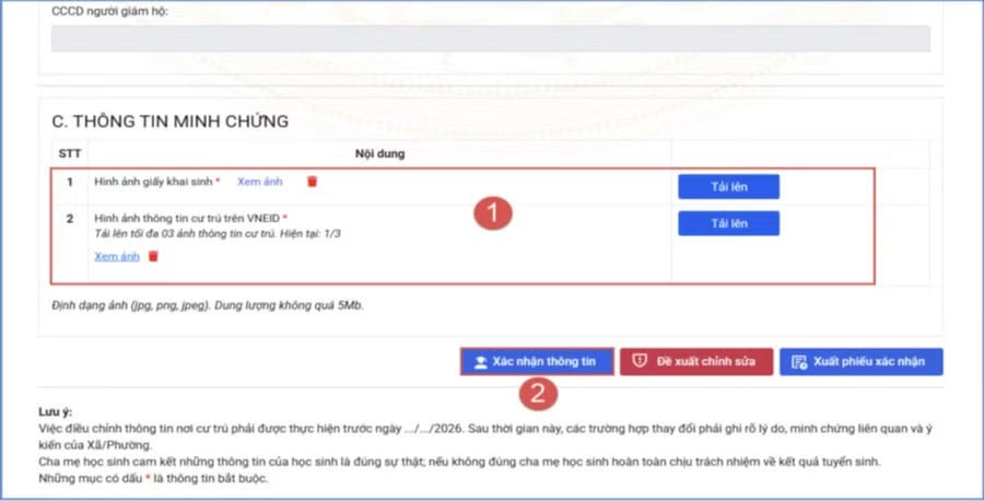 Trong trường hợp thông tin hồ sơ tuyển sinh chính xác, phụ huynh tải lên hình ảnh giấy khai sinh và thông tin cư trú trên ứng dụng VNeID tại mục "Thông tin minh chứng", sau đó nhấn "Xác nhận thông tin".