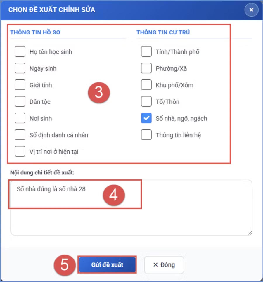 Nếu có thông tin cần điều chỉnh, phụ huynh phải tải lên hình ảnh giấy khai sinh và thông tin cư trú trên VNeID tại mục "Thông tin minh chứng". Sau đó, phụ huynh bấm vào nút "Đề xuất chỉnh sửa" để chọn thông tin chưa chính xác. Sau khi nhập xong nội dung chi tiết đề xuất, phụ huynh bấm vào nút "Gửi đề xuất".