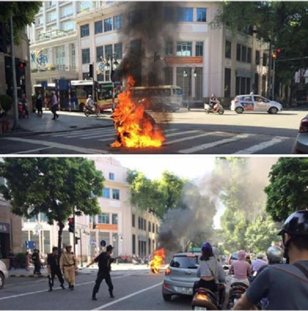 Khoảng 8h sáng ngày 26/9, tại ngã tư Tràng Tiền (Hà Nội) một chiếc xe máy đang lưu thông bỗng dưng bốc cháy ngùn ngụt.