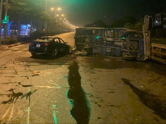 Sau khi va chạm, xe tải lật ngang giữa đường, còn ô tô BMW bốc cháy.