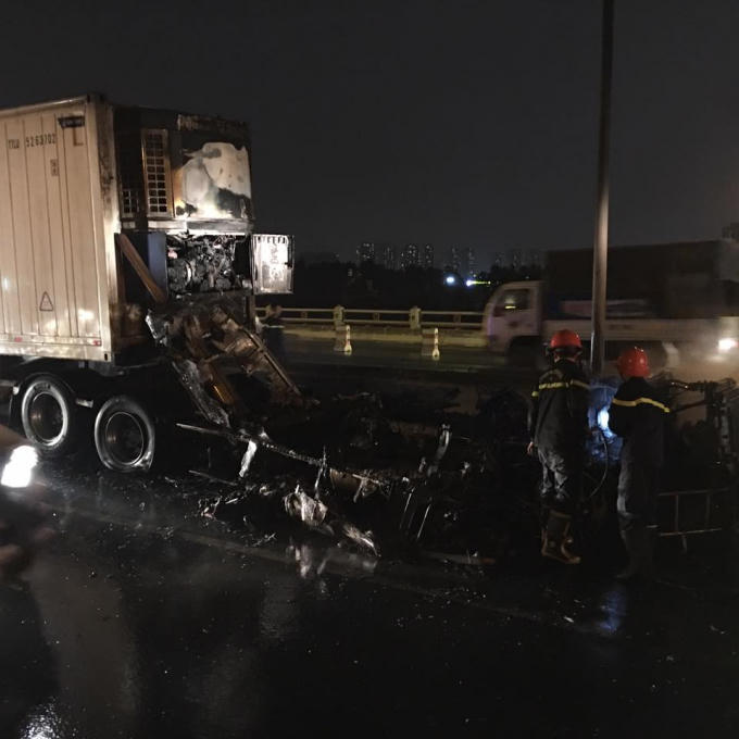 Hiện trường cho thấy đầu chiếc container cháy hoàn toàn chỉ còn trơ khung. Sau khi nhận được tin báo, lực lượng CSGT và cảnh sát PCCC đã có mặt để dập tắt đám cháy.