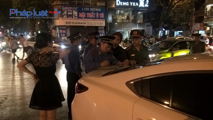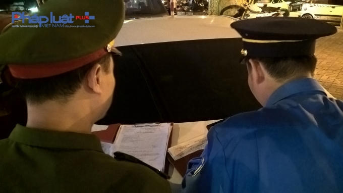 | Lực lượng chức năng tiến hành lập biên bản đối với xe vi phạm. ( Ảnh Phạm Hiển ) |