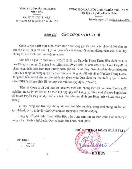 Liên quan đến vụ việc, đại diện Công ty CP Mai Linh Miền Bắc đã có nội dung thông tin cụ thể về sự việc: “Hiện tại, Công ty đã chuyển toàn bộ hồ sơ cho cơ quan Công an và đã nghiêm túc xử lý kỷ luật lái xe theo nội quy quy chế của công ty”.