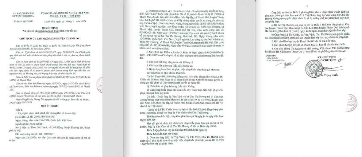 Ngày 30/7/2024 UBND huyện Thanh Oai đã ban hành Quyết định số 5659/QĐ-UB xử phạt vi phạm hành chính 4.000.000 đồng (bốn triệu đồng) đối với bà Lê Thị Chiên.
