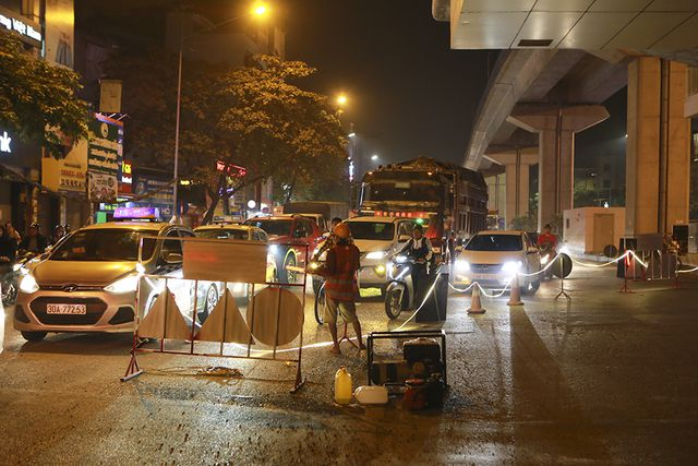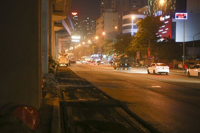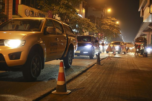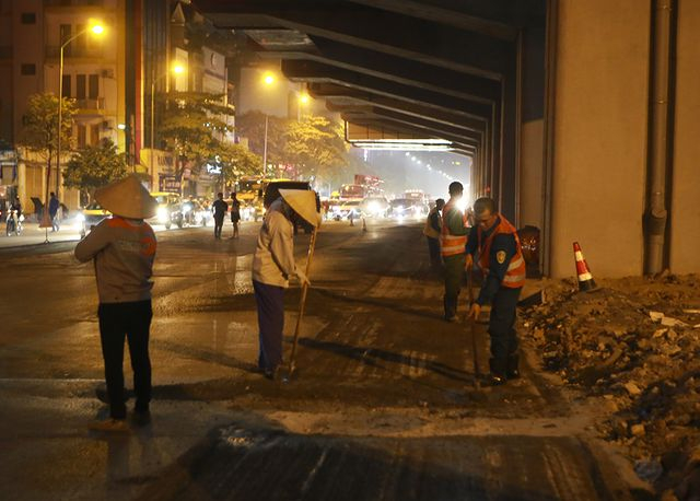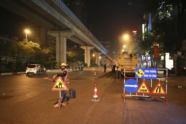 Công việc được tiến hành trong đêm nên mật độ giao thông đi lại thấp, công nhân làm việc dưới ánh sáng của đèn đường.