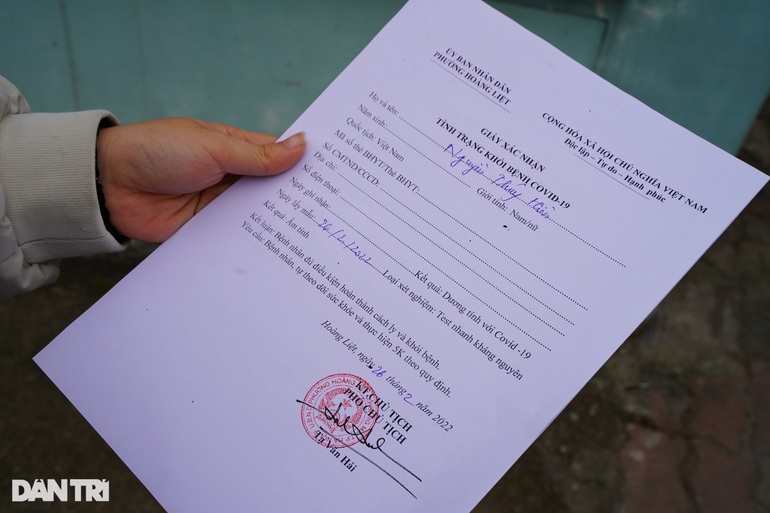 Chị Nguyễn Thúy Hiền, người dân phường Hoàng Liệt là F0 đã khỏi bệnh chia sẻ, theo yêu cầu của công ty là F0 thì phải khai báo với địa phương, sau khi khỏi bệnh cũng phải có giấy xác nhận khỏi bệnh thì mới được đi làm trở lại.