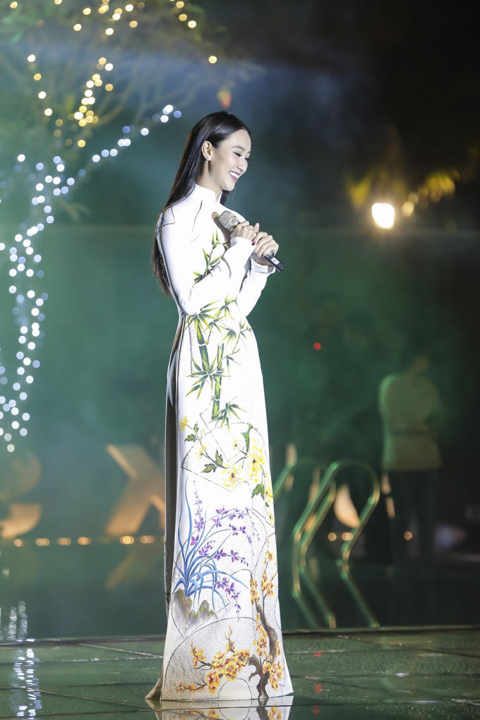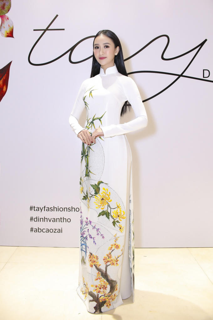 Là một trong những vị khách mời đặc biệt đến tham dự và theo dõi show thời trang “Tay), Hà Thu xuất hiện tại thảm đỏ sự kiện với vẻ đằm thắm “đậm” chất con gái Huế trong tà áo dài của NTK Đinh Văn Thơ (Áo zài ABC).