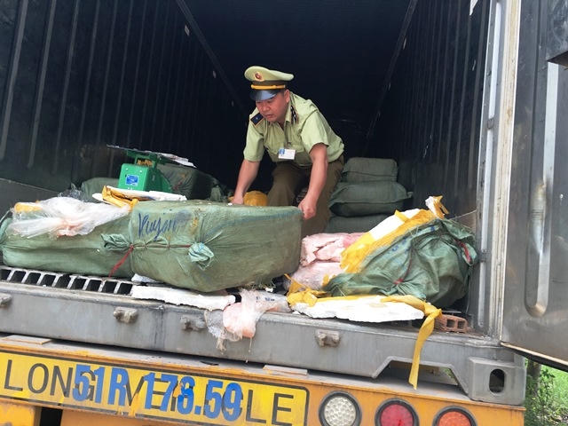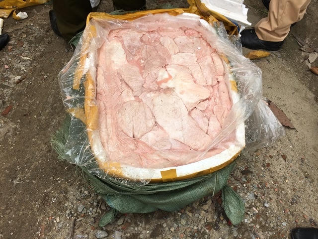 Qua kiểm đếm ban đầu, xác định có 110 thùng xốp đựng thịt và mỡ động vật “bẩn”, với khối lượng lên đến 5,5 tấn không có giấy tờ hợp pháp. Đấu tranh tại chỗ, lái xe Lê Cao Tiến, trú tại TP Quy Nhơn (Bình Định) cho biết, số lượng thịt và mỡ động vật “bẩn” trên được Tiến nhận qua “cò” ở miền bắc, không rõ ai là chủ hàng. Số hàng “bẩn” này, nếu “thông đường” trót lọt sẽ được Tiến đưa vào tiêu thụ tại các tỉnh Miền trung.