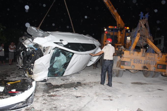 Cú đâm mạnh khiến chiếc xe ô tô 4 chổ mang BKS 37A. 260.08 bay qua dãi phân cách sang bên trái làn đường bị nát bét, 2 người ngồi trong xe ô tô được đưa đi cấp cứu trong tình trạng nguy kịch. Sau khi gây tai nạn, chiếc xe ô tô đầu kéo tiếp tục đâm nát dãi phân cách trên QL 1A rồi lao sang bên trái nằm nghiêng bên vệ đường.