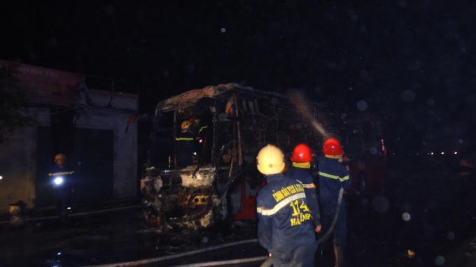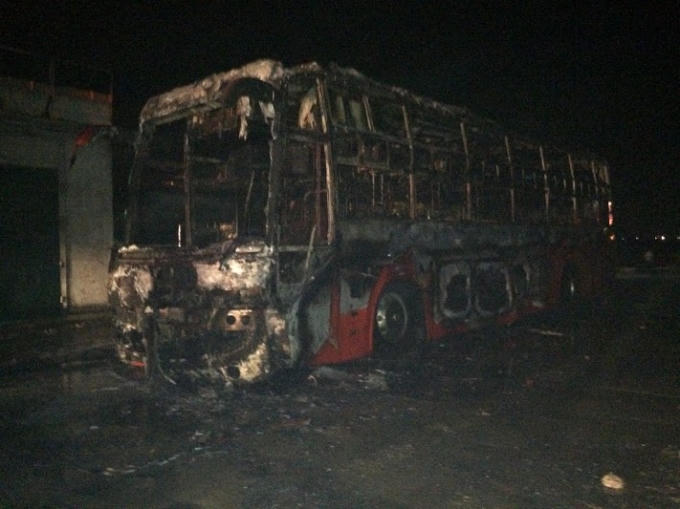 Chiếc xe khách 54 chỗ chỉ còn trơ lại bộ khung, rất may lửa không lan sang các nhà dân cũng như không có thiệt hại về người.