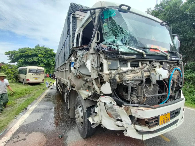 Tại hiện trường, cabin xe tải bị móp méo, biến dạng, dầu chảy ra lênh láng, còn xe khách thì chạy thêm 1 đoạn rồi dừng lại bên vệ đường của làn xe ngược chiều, cửa kính bên phải xe do va chạm vào xe tải nên bị vỡ hầu hết.