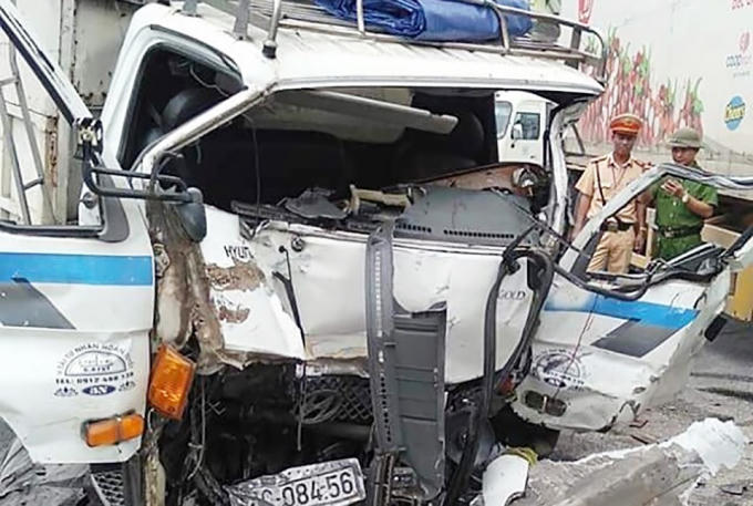 Phần đầu xe tải bị biến dạng hoàn toàn sau cú va chạm trực diện với xe container