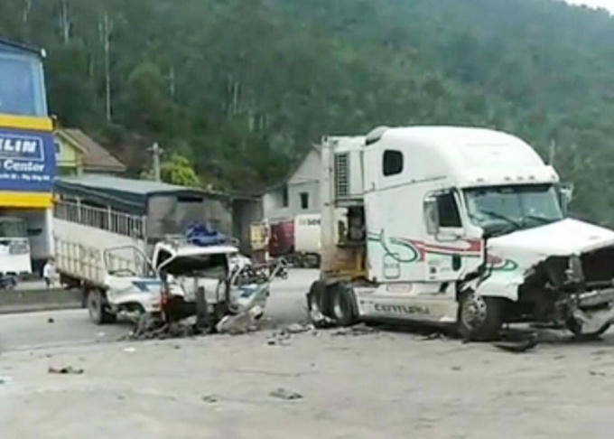 Cú đâm mạnh khiến xe tải bị bẹp nát phần đầu; xe container cũng hư hỏng nhiều bộ phận ở phần đầu kéo.