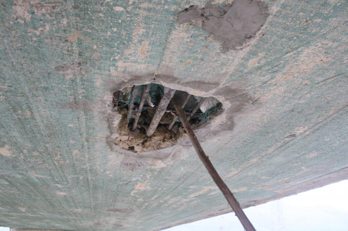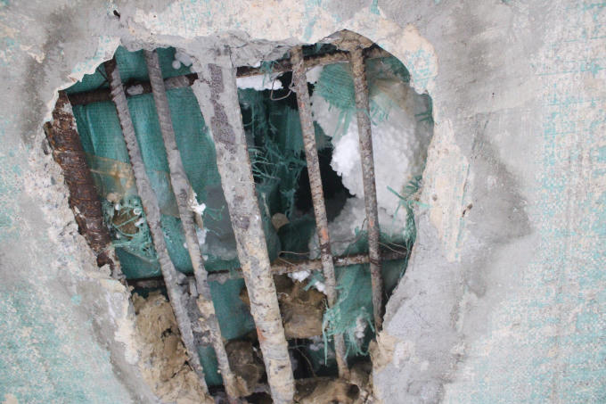 Tại những vị trí xảy ra bong tróc lộ hẳn phần cốt thép và xốp trắng phía trong khiến nhiều người bất an.