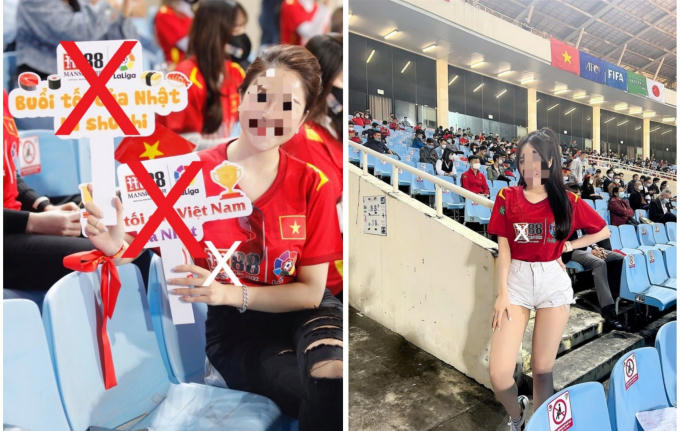 Trong khi đi cổ vũ cho đội tuyển Việt Nam tại SVĐ Mỹ Đình, hai cô gái cũng quảng cáo cho một sàn cờ bạc và cá độ bóng đá trái phép.