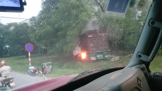 Chiếc xe container bị bốc cháy sau cú va chạm.
