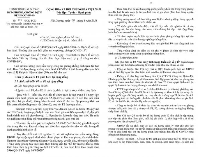 Ngày 9/3, Ban Chỉ đạo Phòng chống dịch bệnh COVID-19 tỉnh Hải Dương đã ban hành Công văn số 775/BCĐ-PCD để hướng dẫn tạm thời việc xử lý khi phát hiện ca bệnh lây nhiễm trong cộng đồng.