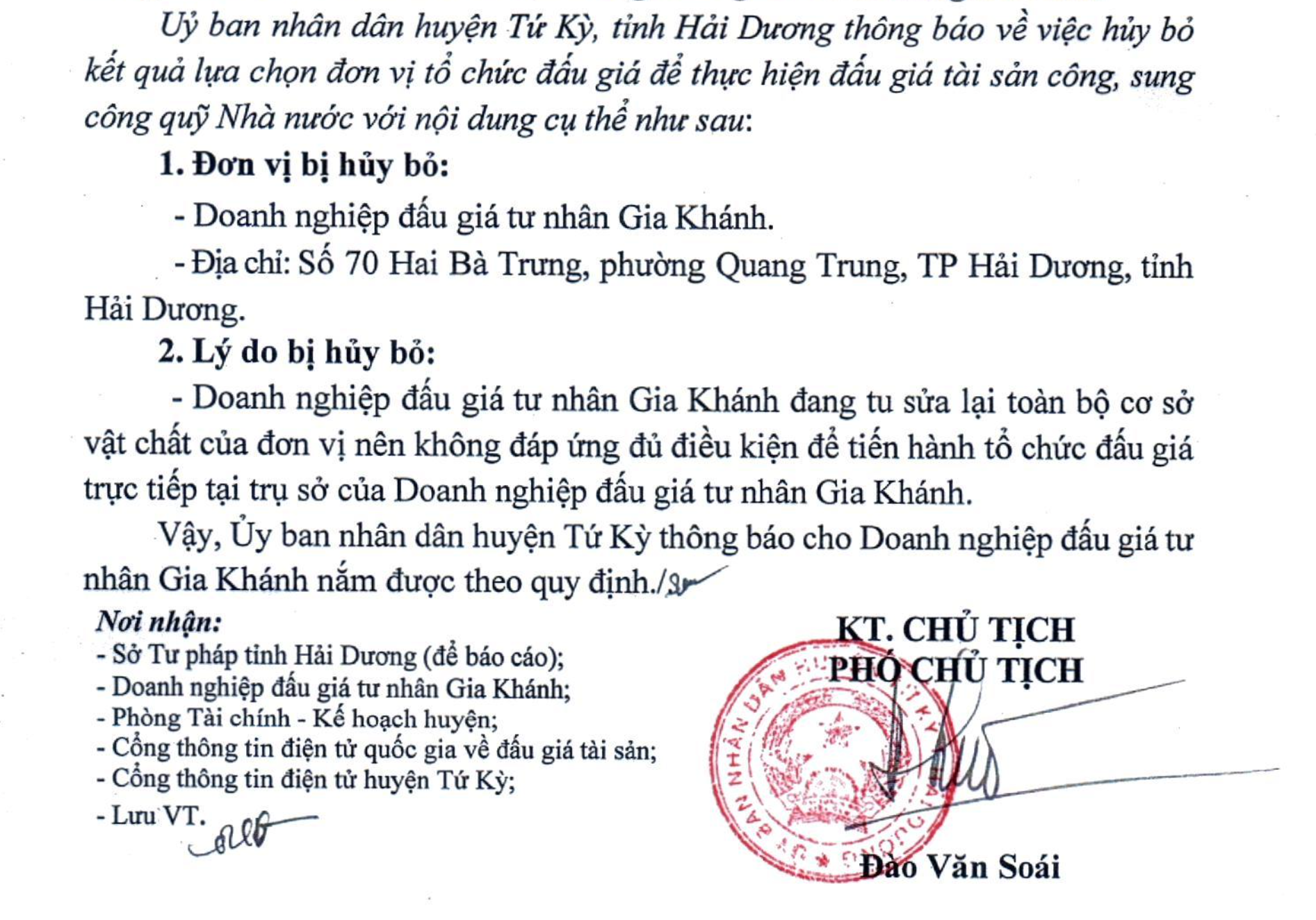 Đến tháng 6/2023, UBND huyện Tứ Kỳ ban hành thông báo Hủy bỏ kết ủa lựa chọn đơn vị tổ chức đấu giá tài sản công thanh lý, sung công quỹ Nhà nước. Theo đó, lý do hủy bỏ: