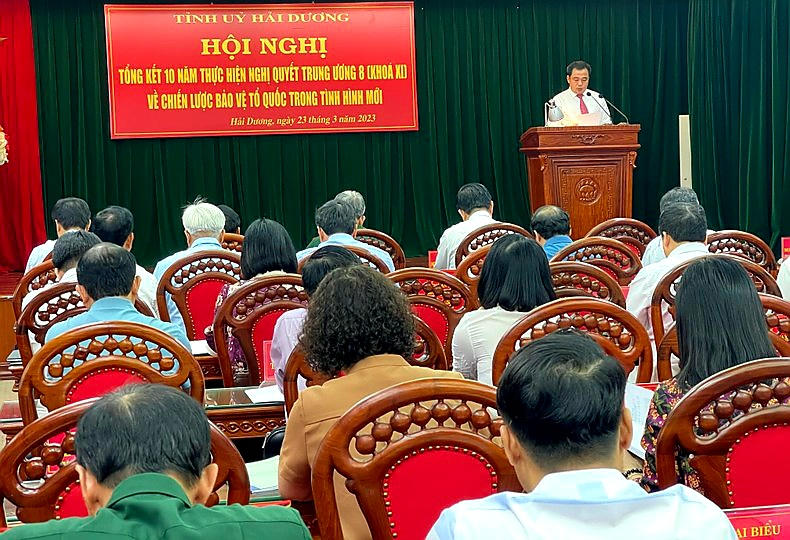 Trong báo cáo kết quả 10 năm thực hiện Nghị quyết Trung ương 8 khóa XI về Chiến lược bảo vệ Tổ quốc trong tình hình mới của tỉnh, nêu rõ Hải Dương nằm ở vị trí trung tâm đồng bằng sông Hồng, trong tam giác kinh tế Hà Nội - Hải Phòng - Quảng Ninh và vùng kinh tế trọng điểm Bắc bộ, là tỉnh đông dân thứ 8 cả nước và thứ 3 trong khu vực đồng bằng sông Hồng. Đảng bộ tỉnh Hải Dương hiện có 15 Đảng bộ trực thuộc, 678 tổ chức cơ sở đảng với hơn 108.000 đảng viên…
